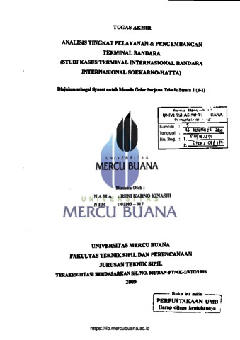 KINASIH, RENI KARNO (2009) ANALISIS TINGKAT PELAYANAN & PENGEMBANGAN TERMINAL BANDARA (STUDI KASUS TERMINAL INTERNASIONAL BANDARA INTERNASIONAL SOEKARNO-HATTA). S1 thesis, Universitas Mercu Buana Jakarta.