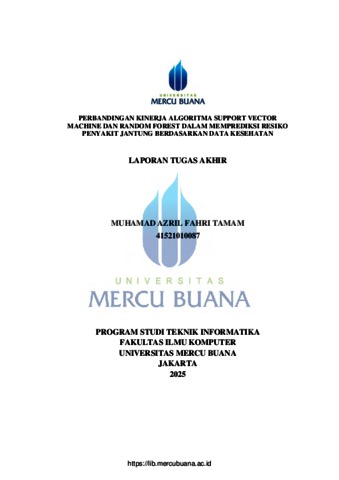 TAMAM, MUHAMAD AZRIL FAHRI (2025) PERBANDINGAN KINERJA ALGORITMA SUPPORT VECTOR MACHINE DAN RANDOM FOREST DALAM MEMPREDIKSI RESIKO PENYAKIT JANTUNG BERDASARKAN DATA KESEHATAN. S1 thesis, Universitas Mercu Buana Jakarta.