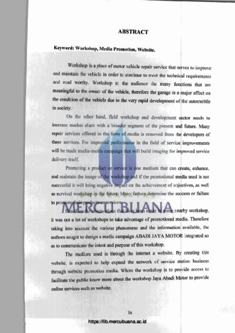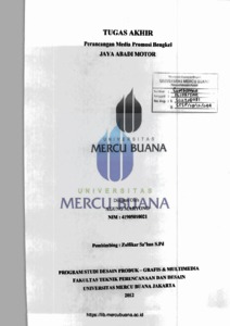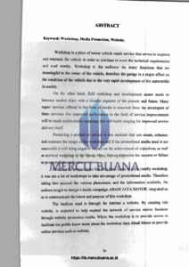 Kata Kunci: Bengkel, Media Promosi, Website. Bengkel merupakan tempat pelayanan jasa perbaikan kendaraan bermotor yang berfungsi untuk memperbaiki dan merawat kendaraan agar tetap memenuhi persyaratan teknis dan layak jalan. Bengkel dalam khalayak orang banyak memiliki fungsi yang berarti bagi pemilik kendaraan, oleh sebab itu bengkel sangat berpengaruh besar terhadap kondisi kendaraan dikarenakan perkembangan otomotif dimasyarakat sangat pesat. Disisi lain, bidang perbengkelan perlu peningkatan dan pengembangan disektor pangsa pasar dengan segmentasi yang lebih luis untu, masa kini dan masa mendatang. Banyak pelayanan jasa perbaikan yang ditawarkan dalam bentuk media-media yang dikeluarkan dari pihak pengembung jasa tersebut. Untuk peningkatan kinerja dalam bidang pelayanan jasa perbaikan ini akan dibuat media-media promosi yang akan membangun pencitraan untuk pelayanan jasa perbaikan itu sendin Mempromosikan produk atau jasa merupakan salah satu media yang dapat menciptakan, mempertinggi, serta memelihara citra perbengkelan dan jika media-media promosi yang digunakan tidak berhasil maka akın membawa dampak negati yang aran tithan, serta kelangsungan Indup perbengkelan dimasa MERCU BUANA mempromosikan produk atau jasanya. menentukan berhasil atau tidaknya Berdasarkan pengamatan yang telah dilakukan terhadap beberapa bengkel disekitarnya, ternyata tidak banyak bengkel yang memanfaatkan media-media promosi. Maka dari itu dengan mempertimbangkan berbagai fenomena dan informasi yang ada, maka penulis berusaha membuat perancangan media promosi JAYA ABADI MOTOR yang terintegrasi sehingga dapat mengkomunikasikan maksud dan tujuan dari bengkel ini. Media yang digunakan yaitu melalui internet berupa website. Dengan membuat website ini, diharapkan dapat membantu proses memperluas jaringan bisnis bengkel melalui media promosi website. Dimana bengkel menyediakan