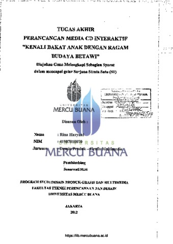 HARYANI, RINA (2012) PERANCANGAN MEDIA CD INTERAKTIF "KENALI BAKAT ANAK DENGAN RAGAM BUDAYA BETAWI". S1 thesis, Universitas Mercu Buana Jakarta.