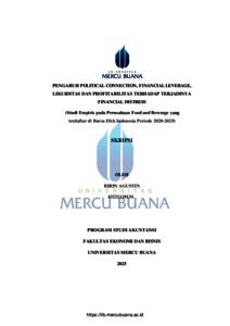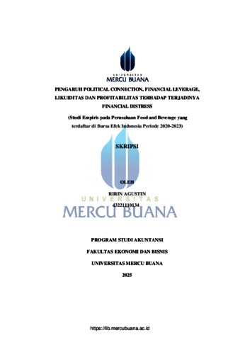 AGUSTIN, RIRIN (2025) PENGARUH POLITICAL CONNECTION, FINANCIAL LEVERAGE, LIKUIDITAS DAN PROFITABILITAS TERHADAP TERJADINYA FINANCIAL DISTRESS (Studi Empiris pada Perusahaan Food and Beverage yang terdaftar di Bursa Efek Indonesia Periode 2020-2023). S1 thesis, Universitas Mercu Buana Jakarta.