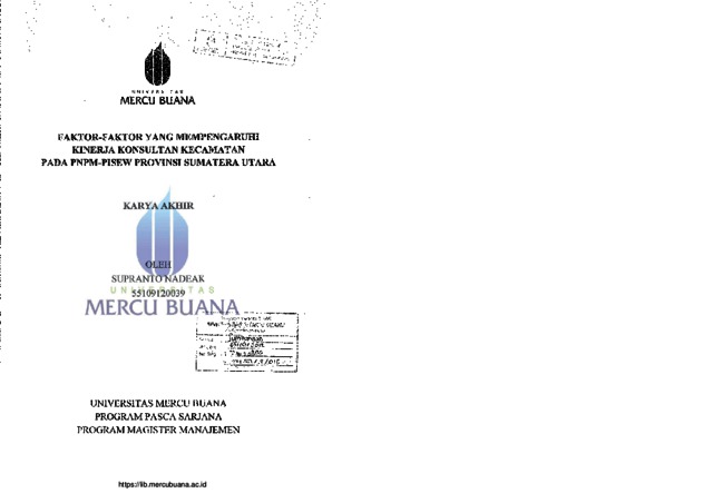 NADEAK, SUPRANTO (2012) FAKTOR-FAKTOR YANG MEMPENGARUHI KINERJA KONSULTAN KECAMATAN PADA PNPM-PISEW PROVINSI SUMATERA UTARA. S2 thesis, Universitas Mercu Buana Jakarta.