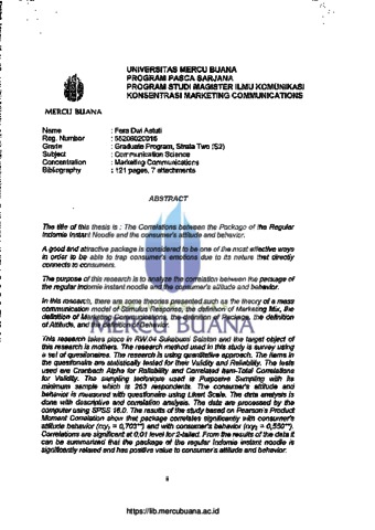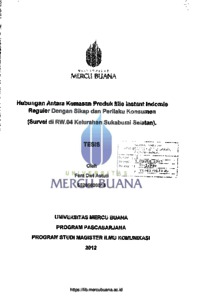 Judul penelitian adalah Hubungan Kemasan Produk Mie Instant Indomie Reguler dengan Sikap dan Perilaku konsumen. Kemasan yang baik dan menarik dianggap sebagai salah satu cara yang ampuh untuk bisa menjebak emosi konsumen karena sifatnya yang berhubungan langsung dengan konsumen. Tujuan yang hendak dicapai dalam penelitian ini adalah menganalisis adanya hubungan (korelasi) kemasan produk mie instan Indomie reguler dengan sikap dan perilaku konsumen. Dalam penelitian ini dikemukakan beberapa teori diantaranya adalah Teori Komunikasi Stimulus-Respon, pengertian Bauran Pemasaran, pengertian Komunikasi Pemasaran, pengertian Kemasan, pengertian Sikap Konsumen dan pengertian Perilaku Konsumen. MERCU BUANA Penelitian ini dilakukan di lingkungan RW.04 kelurahan Sukabumi Selatan dan sasaran obyek penelitian ini adalah para kaum ibu Penelitian ini menggunakan pendekatan kuantitatif. Metode penelitian yang digunakan adalah metode survei dengan menggunakan kuesioner. Item-item dalam kuesioner telah melalui uji validitas dengan menggunakan Correlated Item-Total Correlations dan uji reliabilitas dengan menggunakan Cronbach Alpha. Teknik sampling yang digunakan adalah dengan purposive sampling dengan jumlah sampel sebanyak 263 responden. Sikap dan perilaku konsumen diukur dengan menggunakan instrumen kuesioner dengan skala likert. Analisa data menggunakan analisa deskriptif dan korelasi dengan program SPSS 16.0. Hasil penelitian yang menggunakan uji korelasi Pearson's Product Moment menyatakan bahwa kemasan produk berkorelasi signifikan dengan sikap ( rx*y_{1} = 0 ,703^ ** ) dan perilaku ( nx*y_{2} = 0 ,550^ ** ) Korelasi signifikan pada level 0,01 sisi. Dari hasil diperoleh maka dapat disimpulkan bahwa kemasan produk mie instant Indomie reguler mempunyai hubungan (korelasi) yang signifikan dan bernilai positif dengan sikap dan perilaku.