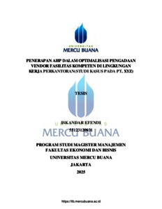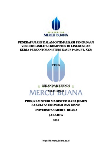 EFENDI, ISKANDAR (2025) PENERAPAN AHP DALAM OPTIMALISASI PENGADAAN VENDOR FASILITAS KOMPETEN DI LINGKUNGAN KERJA PERKANTORAN (STUDI KASUS PADA PT. XYZ). S2 thesis, Universitas Mercu Buana Jakarta.