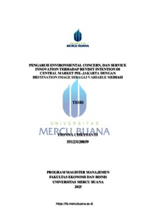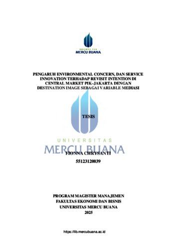 CHRYSANTI, FIONNA (2025) PENGARUH ENVIRONMENTAL CONCERN, DAN SERVICE INNOVATION TERHADAP REVISIT INTENTION DI CENTRAL MARKET PIK - JAKARTA DENGAN DESTINATION IMAGE SEBAGAI VARIABLE MEDIASI. S1 thesis, Universitas Mercu Buana Jakarta.