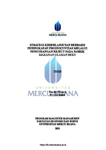 WIJAYA, PANDU (2025) STRATEGI KEBERLANJUTAN BERBASIS PENINGKATAN PRODUKTIVITAS MELALUI PENGURANGAN REJECT PADA PABRIK MAKANAN OLAHAN BEKU. S2 thesis, Universitas Mercu Buana Jakarta.