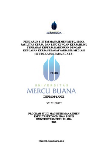 SOPYANDI, DEPI (2025) PENGARUH SISTEM MANAJEMEN MUTU, SMK3, FASILITAS KERJA, DAN LINGKUNGAN KERJA HIJAU TERHADAP KINERJA KARYAWAN DENGAN KEPUASAN KERJA SEBAGAI VARIABEL MEDIASI (STUDI KASUS PADA PT XYZ). S2 thesis, Universitas Mercu Buana Jakarta.