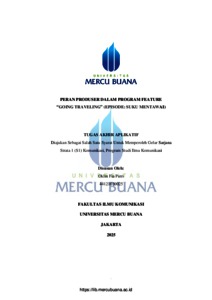 The feature film titled “The Role of Producers in the Production of the Feature Program ‘Going Traveling’ Episode: Mentawai Tribe” depicts events from the Mentawai Tribe in West Sumatra. As the producer, the author presents how the Mentawai people continue to uphold their customs and ancestral beliefs. This culture is one of the ancestral heritages rich in philosophy and traditions. As a producer, the author showcases the cultural richness of the Mentawai Tribe to the audience through a strong narrative and authentic visuals. Through indepth research, meticulous planning, and effective team coordination, the author ensures that every aspect of production runs smoothly, delivering cultural messages in an informative, educational, and engaging manner. This work is expected to contribute academically as a reference for media production studies and the role of producers in culture-based feature programs. Furthermore, this report can serve as a valuable resource for the creative industry in producing content that is not only entertaining but also educational, while playing a role in preserving the Mentawai Tribe’s culture and strengthening Indonesia’s image as a nation with diverse and valuable cultural heritage. Keywords: Producer’s Role, Feature Program, Television Production, Mentawai Tribe, Local Culture. Film feature yang berjudul “Peran Produser dalam Produksi Program Feature ‘Going Traveling’ Episode: Suku Mentawai” merupakan peristiwa yang diangkat dari Suku Mentawai di Sumatera Barat. Penulis sebagai produser memaparkan bagaimana kehidupan masyarakat Mentawai yang masih mempertahankan adat istiadat serta kehidupan kepercayaan yang mereka anut. Budaya ini merupakan salah satu warisan leluhur yang kaya akan nilai filosofi dan tradisi. Sebagai produser, penulis memaparkan kepada khalayak kekayaan budaya Suku Mentawai melalui narasi yang kuat dan visual yang autentik. Dengan riset mendalam, perencanaan matang, serta koordinasi tim yang efektif, penulis memastikan bahwa setiap aspek produksi berjalan lancar dan mampu menyampaikan pesan budaya secara informatif, edukatif, dan menarik. Karya ini diharapkan dapat memberikan kontribusi dalam bidang akademik sebagai referensi dalam studi produksi media dan peran produser dalam program feature berbasis budaya. Di samping itu, laporan ini juga dapat menjadi acuan bagi industri kreatif dalam menghadirkan konten yang tidak hanya menghibur tetapi juga mendidik, sekaligus berperan dalam melestarikan budaya Suku Mentawai dan memperkuat citra Indonesia sebagai negara dengan warisan budaya yang beragam dan bernilai tinggi. Kata Kunci: Peran Produser, Program Feature, Produksi Televisi, Suku Mentawai, Budaya Lokal.