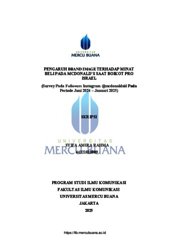 RAHMA, SYIFA AMIRA (2025) PENGARUH BRAND IMAGE TERHADAPMINAT BELI PADA MCDONALD'S SAAT BOIKOT PRO ISRAEL (Survey Pada Followers Instagram @mcdonaldsid Pada Periode Juni 2024 - Januari 2025). S1 thesis, Universitas Mercu Buana Jakarta.