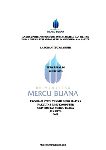 RIZALDI, TEDY (2025) ANALISA PERBANDINGAN QOS ANTARA 802.11AC DAN 802.11AX PADA APLIKASI STREAMING NETFLIX MENGGUNAKAN LAPTOP. S1 thesis, Universitas Mercu Buana Jakarta.