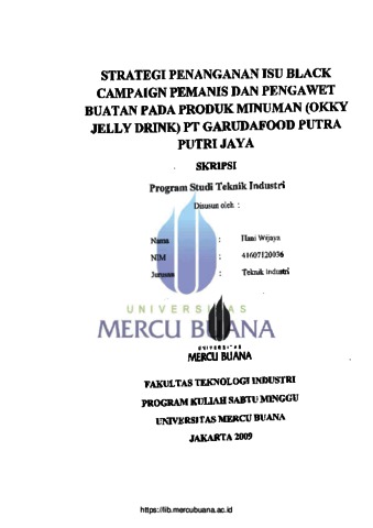 WIJAYA, HANI (2009) STRATEGI PENANGANAN ISU BLACK CAMPAIGN PEMANIS DAN PENGAWET BUATAN PADA PRODUK MINUMAN (OKKY JELLY DRINK) PT GARUDAFOOD PUTRA PUTRI JAYA. S1 thesis, Universitas Mercu Buana Jakarta.