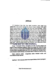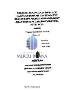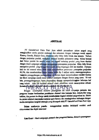 PT GarudaFood Putra Putri Jaya adalah perusahaan dalam negeri yang menghasilkan aneka produk makanan dan minuman dengan beberapa merek seperti Kacang Garuda, Biskuit Gery, Minuman jelly Okky Jelly Drink dan lainnya. Terkait dengan penjualan produk, seringkali ditemui kendala pemasaran yang bukan berasal dari faktor produk itu sendiri tetapi isu negatif terhadap produk yang biasa disebut dengan black campaign sehingga mengganggu pencapaian penjualan. Okky Jelly Drink merupakan produk yang hingga kini masih sering terganggu oleh isu tersebut. Pertama kali isu ini muncul tahun 2006 telah menyebabkan penurunan pencapaian penjualan 41,3%, dan membutuhkan biaya kurang lebih Rp 5 milyar untuk menanggulanginya. Ternyata penaggulangan permasalahan ini belum dapat menyelesaikan masalah karena isu black campaign masih terus muncul meskipun dengan format yang sama. Di sisi lain, penanggulangannya harus disesuaikan dengan mempertimbangkan beberapa hal yang terkait. Atas hal tersebut muncul suatu pemikiran untuk menciptakan sebuah formulasi strategi yang tepat untuk mengatasi black campaign. DUAN MERC Dengan menetapkan skenario penanganan isu black campaign pemanis dan pengawet buatan berdasarkan pendekatan channel issu (saluran isu), stakeholder yang terlibat, dan person in-charge untuk membedakan tingkat eskalasi pergerakan isu. Selain itu proses edukasi masyarakat melalui open factory dan meningkatkan hubungan dengan media merupakan langkah strategis yang ditempuh oleh PT GarudaFood Putra Putri Jaya Dalam analisanya penulis menggunakan analisa deskriptif melalui studi dokumentasi dan depth interview Kata Kunci: black campaign, pemanis dan pengawet buatan, skenario penanganan