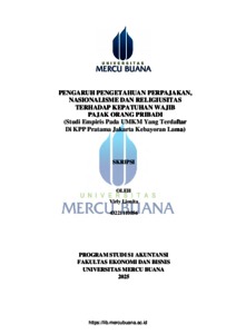 LIONITA, VIRLY (2025) PENGARUH PENGETAHUAN PERPAJAKAN, NASIONALISME DAN RELIGIUSITAS TERHADAP KEPATUHAN WAJIB PAJAK ORANG PRIBADI (Studi Empiris Pada UMKM Yang Terdaftar Di KPP Pratama Jakarta Kebayoran Lama). S1 thesis, Universitas Mercu Buana Jakarta.