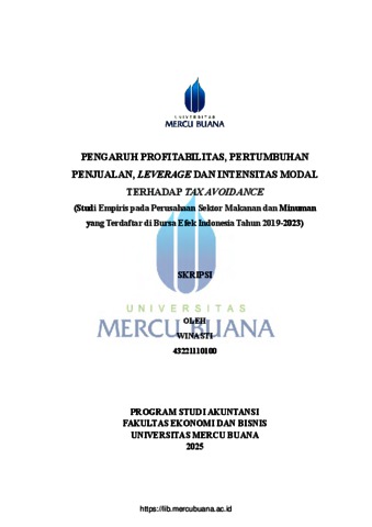 WINASTI, WINASTI (2025) PENGARUH PROFITABILITAS, PERTUMBUHAN PENJUALAN, LEVERAGE DAN INTENSITAS MODAL TERHADAP TAX AVOIDANCE (Studi Empiris pada Perusahaan Sektor Makanan dan Minuman yang Terdaftar di Bursa Efek Indonesia Tahun 2019-2023). S1 thesis, Universitas Mercu Buana Jakarta.