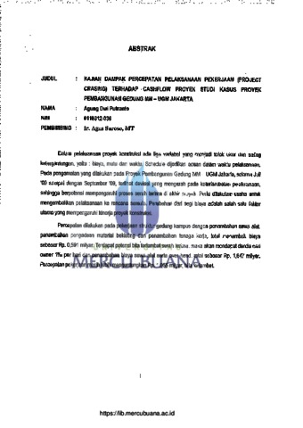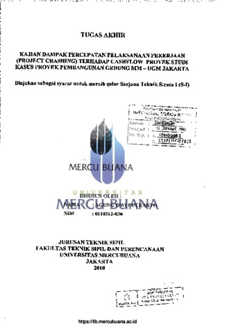 PUTRANTO, AGUNG DWI (2010) KAJIAN DAMPAK PERCEPATAN PELAKSANAAN PEKERJAAN (PROJECT CRASHING) TERHADAP CASHFLOW PROYEK STUDI KASUS PROYEK PEMBANGUNAN GEDUNG MM-UGM JAKARTA. S1 thesis, Universitas Mercu Buana Jakarta.