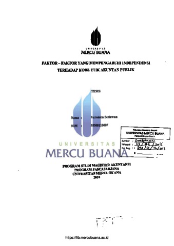 SETIAWAN, VERONICA (2010) FAKTOR-FAKTOR YANG MEMPENGARUHI INDEPENDENSI TERHADAP KODE ETIK AKUNTAN PUBLIK. S2 thesis, Universitas Mercu Buana Jakarta.