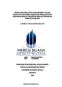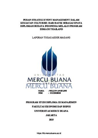 ANGELINE, WILLYN (2025) PERAN STRATEGI EVENT MANAGEMENT DALAM KEGIATAN CULTURISE: HARI BATIK SEBAGAI UPAYA DIPLOMASI BUDAYA INDONESIA MELALUI PROGRAM IISMA DI THAILAND. D3 thesis, Universitas Mercu Buana Jakarta.