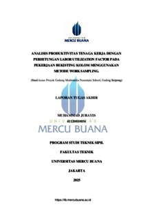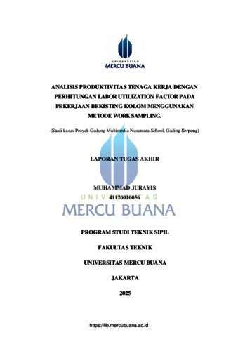 JURAYIS, MUHAMMAD (2025) ANALISIS PRODUKTIVITAS TENAGA KERJA DENGAN PERHITUNGAN LABOR UTILIZATION FACTOR PADA PEKERJAAN BEKISTING KOLOM MENGGUNAKAN METODE WORK SAMPLING. (Studi kasus Proyek Gedung Multimedia Nusantara School, Gading Serpong). S1 thesis, Universitas Mercu Buana Jakarta.