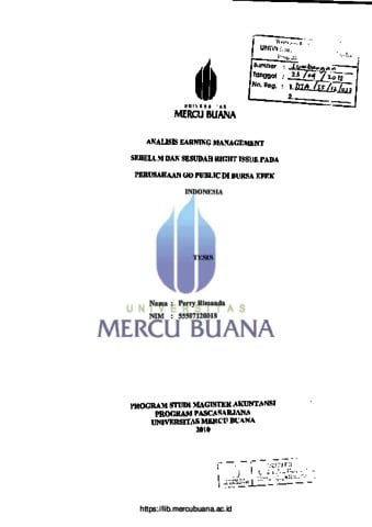 RIMANDA, PERRY (2010) ANALISIS EARNING MANAGEMENT SEBELUM DAN SESUDAH RIGHT ISSUE PADA PERUSAHAAN GO PUBLIC DI BURSA EFEK INDONESIA. S2 thesis, Universitas Mercu Buana Jakarta.