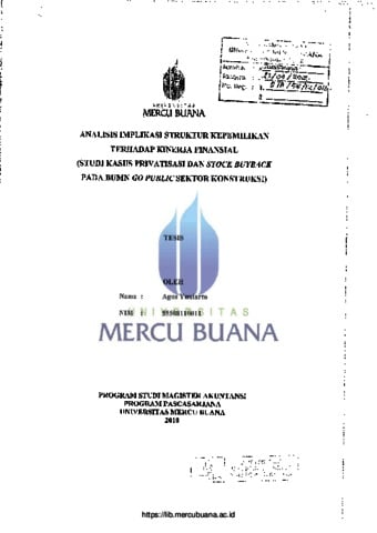 YUNIARTO, AGUS (2010) ANALISIS IMPLIKASI STRUKTUR KEPEMILIKAN TERHADAP KINERJA FINANSIAL (STUDI KASUS PRIVATISASI DAN STOCK BUYBACK PADA BUMN GO PUBLIC SEKTOR KONSTRUKSI). S2 thesis, Universitas Mercu Buana Jakarta.