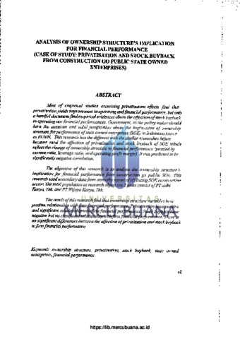 Most of empirical studies examining privatization effects find that privatisation yields improvement in operating and financial performance, but one a handful document find empirical evidences about the affection of stock buybach to operating nor financial performances. Government, as the policy maker shoule have the accurate and valid justification about the implication of ownership structure for performance of state owned enterprises (SOE) in Indonesia known as BUMN. This research has the different with the similar researches before because used the affection of privatisation and stock bayback of SOE which reflect the change of ownership structure to financial performance (proxied by current ratio, leverage ratio, and operating profit margin). It was predicted to be significantly negative correlation. The objective of this research is to analyse the ownership structures implication for financial performance from construction go public SOE. Thi research used secondary data from annually report of all listing SOE construction sector. The total population as research object are 2 units consist of PT Adhi Karya, Tbk. and PT Wijaya Karya, Tbk. The result of this research find that ownership structure variables have positive relationship with firm financial performance Privetisation have positive and significant relationship with firm financial performance. Stock buyhack have negative but no significant relationship with firm finencial performance. There is no significant differences between the affection of privatization and stock buybac to firm financial performance. Keyword: ownership structure, privatisation, stock buyback, state owned enterprises, financial performance