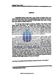 Pengendalian kualitas produk dalam proses produksi merupakan faktor yang sangat penting bagi dunia industri karena pengendalian kualitas yang baik dan dilakukan secara terus menerus akan dapat mendeteksi ketidaknormalan secara cepat, sehingga dapat segara dilakukan tindakan antisipasinya. PT. Tembaga Mulia Semanan merupakan perusahaan yang bergerak dalam bidang Industri Almuminiuml. PT. Tembaga Mulia Semanan selalu menjaga dan meningkatkan kualitas produknya agar selalu dapat memenuhi keinginan konsumen. Berdasarkan latar belakang masalah diatas, maka permasalahan yang akan diteliti adalah bagaimana pengendalian kualitas statistik produk batangan kawat dan apakah proses produksi terjadi di luar batas kandali (out of control) dan apa penyebabnya? Jenis reject yang ditemukan ada empat yaitu: CR (Copper Rod), BCW (Bunched Copper Wire), DCW (Drawing Copper Wire), STCCW (Single Tin Coated Copper Wire), LN (Lain-lain) dan cacat yang paling dominan terjadi adalah zacat CR (Copper Rod). Hasil penelitian yang diperoleh yaitu pengendalian kualitas statistik masih berada di luar batas kendali sehingga harus di lakukan revisi. Dengan rata-rata cacat P= 0,014 batas kendali rata-rata UCL-0,0.8 dan LCL=0,01 maka simpulan dari penelitian ini adalah bahwa proses produksi batangan kawat alumuminium di PT. Tembaga Mulia Semanan secara keseluruhan sudah cukup baik dan proses awal yang terjadi adalah di luar batas pengendali satatistik (out of control) sehingga perlu diadakan suatu perbaikan. Saran yang dapat diberikan adalah hasil penelitian diharapkan akan dapat memberikan masukan sebagai dasar pertimbangan dalam pengambilan keputusan terutama yang berkaitan dengan upaya pencapaian kualitas produksi. melakukan perbaikan-perbaikan kerja pada pekerja dengan cara memberikan pelatihan-pelatihan agar para pekerja terampil dan lebih teliti, menjaga dan mengawasi secara ketat kualitas bahan baku (batangan kawat) yang akan dipakai dalam proses yang meliputi kebersihan, pengaturan letak dan suhu ruangan, selalu melakukan review tentang metode-metode kerja yang memudahkan operator sehingga akan meminimalisir tingkat kesalahan yang dilakukan operator. Penanggulangan tersebut diharapkan akan meningkatkan pengendalian kualitas perusahaan sesuai dengan keinginan dan kepuasan pelanggan.