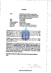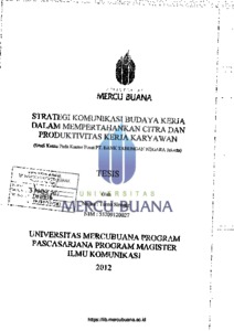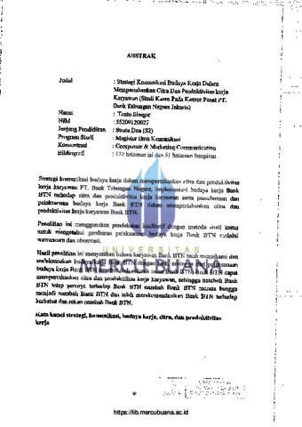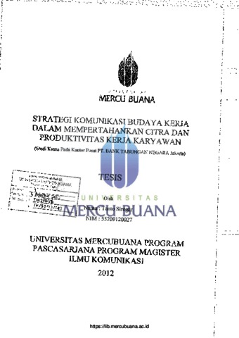 Strategi komunikasi budaya kerja dalam mempertahankan citra dan produktivitas kerja karyawan PT. Bank Tabungan Negara, implementasi budaya kerja Bank BTN terhadap citra dan produktivitas kerja karyawan serta pemahaman dan pelaksanaan budaya kerja Bank BTN dalam mempertahankan citra dan produktivitas kerja karyawan Bank BTN. Penelitian ini menggunakan pendekatan kualitatif dengan metode studi kasus untuk mengetahui gambaran pelaksanaan budaya kerja Bank BTN melalui wawancara dan observasi. UNIVERSITAS MERCU BUANA dapat Hasil penelitian ini menyatakan bahwa karyawan Bank BTN telah memahami dan melaksanakan budaya kerja Bank BTN dengan baik, sehingga dari pelaksa budaya kerja Bank BTN tersebut oleh seluruh insan Bane BTN, Bank BTN mempertahankan citra dan produktifitas kerja karyawan, sehingga nasabah Bank BTN tetap percaya terhadap Bank BTN nasabah Bank BTN merasa bangga menjadi nasabah Bank BTN dan telah merekomendasikan Bank BTN terhadap kerbabat dan rekan nasabah Bank BTN. Kata kunci strategi, komunikasi, budaya kerja, citra, dan produktivitas kerja