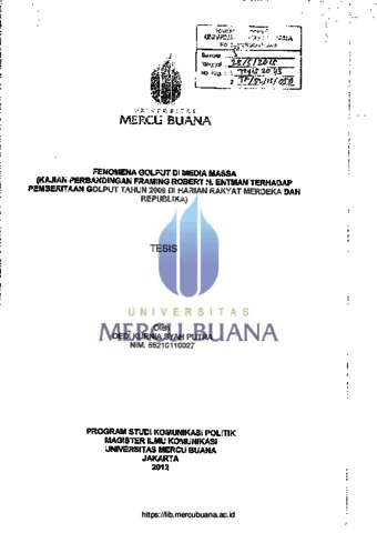 SYAHPUTRA, DEDI KURNIA (2012) FENOMENA GOLPUT DI MEDIA MASSA (KAJIAN PERBANDINGAN FRAMING ROBERT N.ENTMAN TERHADAP PEMBERITAAN GOLPUT TAHUN 2009 DI HARIAN RAKYAT MERDEKA DAN REPUBLIKA). S2 thesis, Universitas Mercu Buana Jakarta.