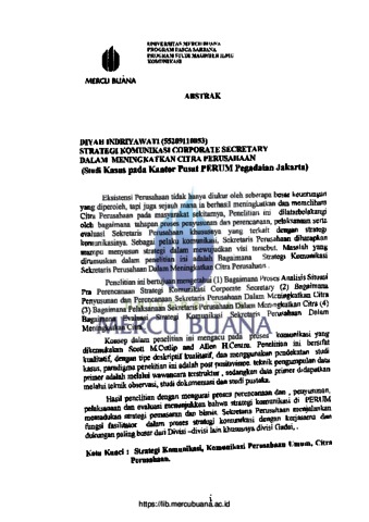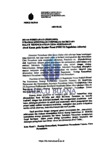 Eksistensi Perusahaan tidak hanya diukur oleh seberapa besar keuntungan yang diperoleh, tapi juga sejauh mana ia berhasil meningkatkan dan memelihara Citra Perusahaan pada masyarakat sekitarnya, Penelitian ini dilatarbelakangi oleh bagaimana tahapan proses penyusunan dan perencanaan, pelaksanaan serta evaluasi Sekretaris Perusahaan khususnya yang terkait dengan strategi komunikasinya. Sebagai pelaku komunikasi, Sekretaris Perusahaan diharapkan mampu menyusun strategi dalam mewujudkan visi tersebut. Masalah yang dirumuskan dalam penelitian ini adalah Bagaimana Strategi Komunikasi Sekretaris Perusahaan Dalam Meningkatkan Citra Perusahaan. Penelitian ini bertujuan mengetahui (1) Bagaimana Proses Analisis Situasi Pra Perencanaan Strategi Komunikasi Corporate Secretary (2) Bagaimana Penyusunan dan Perencanaan Sekretaris Perusahaan Dalam Meningkatkan Citra (3) Bagaimana Pelaksanaan Sekretaris Perusahaan Dalam Meningkatkan Citra (4) Bagaimana Eval Evaluasi Strategi Strategi Komunikasi Sekretaris Perusahaan Dalam Meningkatkan Cin Cu BUANA Konsep dalam penelitian ini mengacu pada proses komunikasi yang dikemukakan Scott M.Cutlip and Allen H.Centre. Penelitian ini bersifat kualitatif, dengan tipe deskriptif kualitatif, dan menggunakan pendekatan studi kasus, paradigma penelitian ini adalah post positivisme. teknik pengumpulan data primer adalah melalui wawancara terstruktur, sedangkan data primer didapatkan melalui teknik observasi, studi dokumentasi dan studi pustaka. Hasil penelitian dengan mengurai proses perencanaan dan, penyusunan, pelaksanaan dan evaluasi menunjukkan bahwa strategi komunikasi di PERUM memadukan strategi pemasaran dan bisnis. Sekretaris Perusahaan menjalankan fungsi fasilitator dalam proses strategi komunikasi dengan kerjasama dan dukungan paling besar dari Divisi-divisi lain khususnya divisi Gadai,.. Kata Kunci: Strategi Komunikasi, Komunikasi Perusahaan Umum, Citra Perusahaan.