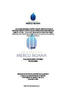 HADIWANTORO, NAZAR (2025) ANALISIS KINERJA SUPPLY CHAIN MENGGUNAKAN METODE GREEN SUPPLY CHAIN OPERATIONS REFERENCE (GREEN SCOR) - ANALYTIC HIERARCHY PROCESS (AHP) (STUDI KASUS PROYEK PEMBANGUNAN GEDUNG 8 LANTAI DI PAPUA BARAT). S2 thesis, Universitas Mercu Buana Jakarta.