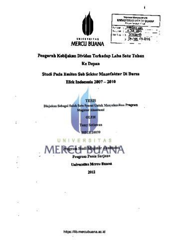 SETIAWAN, TEMY (2012) Pengaruh Kebijakan Dividen Terhadap Laba Satu Tahun Ke Depan Studi Pada Emiten Sub Sektor Manufaktur Di Bursa Efek Indonesia 2007-2010. S2 thesis, Universitas Mercu Buana Jakarta.