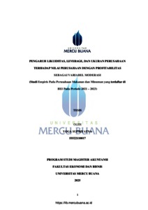 SUPRIYATNA, YOGA (2025) PENGARUH LIKUIDITAS, LEVERAGE, DAN UKURAN PERUSAHAAN TERHADAP NILAI PERUSAHAAN DENGAN PROFITABILITAS SEBAGAI VARIABEL MODERASI (Studi Empiris Pada Perusahaan Makanan dan Minuman yang terdaftar di BEI Pada Periode 2021 - 2023). S2 thesis, Universitas Mercu Buana Jakarta.