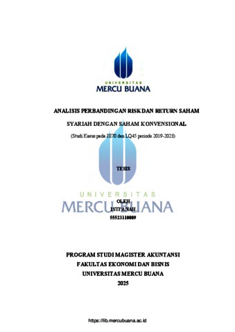 ISTI'ANAH, ISTI'ANAH (2025) ANALISIS PERBANDINGAN RISK DAN RETURN SAHAM SYARIAH DENGAN SAHAM KONVENSIONAL (Studi Kasus pada JII70 dan LQ45 periode 2019-2023). S2 thesis, Universitas Mercu Buana Jakarta.