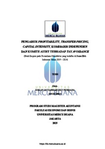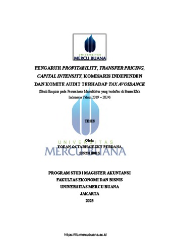 PERDANA, YOEAN OCTARHAIEZKY (2025) PENGARUH PROFITABILITY, TRANSFER PRICING, CAPITAL INTENSITY, KOMISARIS INDEPENDEN DAN KOMITE AUDIT TERHADAP TAX AVOIDANCE (Studi Empiris pada Perusahaan Manufaktur yang terdaftar di Bursa Efek Indonesia Tahun 2019 - 2024). S2 thesis, Universitas Mercu Buana Jakarta.
