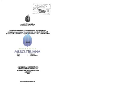 T, HUSAIN (2014) ANALISIS IMPLEMENTASI PERSONAL SELLING PADA PEMBENTUKAN SIKAP WALI MURID MEMILIH SEKOLAH (Studi Kasus Pada SMP Islam Terpadu Nururrahman Tahun Ajaran 2013/2014). S2 thesis, Universitas Mercu Buana Jakarta.