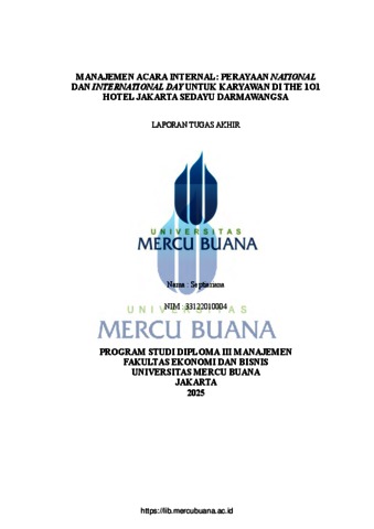 SEPTIARIANA, SEPTIARIANA (2025) MANAJEMEN ACARA INTERNAL: PERAYAAN NATIONAL DAN INTERNATIONAL DAY UNTUK KARYAWAN DI THE 1O1 HOTEL JAKARTA SEDAYU DARMAWANGSA. D3 thesis, Universitas Mercu Buana Jakarta.