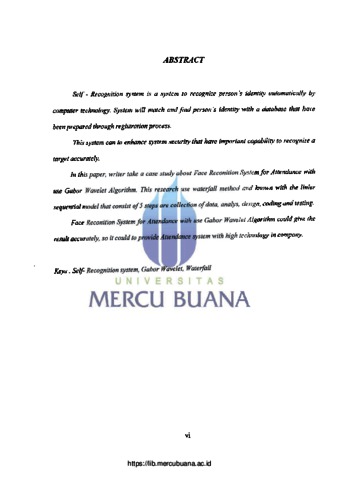 Sistem pengenalan diri adalah sistem untuk mengenali identitas seseorang secara otomatis dengan menggunakan teknologi komputer. Sistem akan mencari dan mencocokkan identitas seseorang dengan suatu basisdata acuan yang telah disiapkan sebelumnya melalui proses pendaftaran. Sistem pengenalan diri bertujuan untuk meningkatkan keamanan sistem sehingga kemampuan sistem pengenalan diri dalam mengenali target secara tepat adalah sangat penting. Dalam Tugas Akhir ini penulis mengambil studi kasus Sistem Pengenalan Wajah untuk Absensi dengan menggunakan algoritma Gabor Wavelet. Metode yang digunakan untuk penelitian ini adalah metode waterfall atau sekarang disebut dengan the linier sequential model yang terdiri dari 5 tahap yaitu pengumpulan data, analisis, desain, pengkodean, pengujian. Sistem Pengenalan Wajah untuk Absensi dengan menggunakan algoritma Gabor Wavelet dapat memberikan hasil yang akurat, sehingga dapat membantu perusahaan dalam menyediakan UNIVERSITAS sistem Absensi dengan teknologi tinggi. MERCU BUANA Kata Kunci: Sistem pengenalan diri, Gabor Wavelet, Waterfall