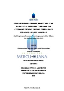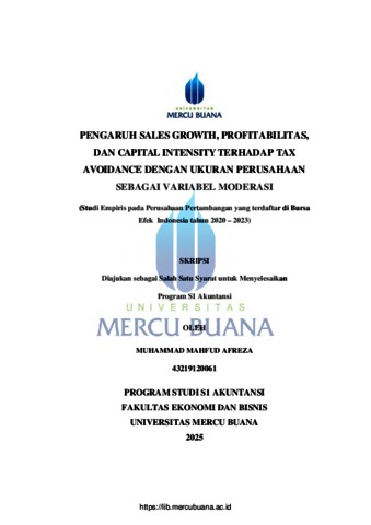 AFREZA, MUHAMMAD MAHFUD (2025) PENGARUH SALES GROWTH, PROFITABILITAS, DAN CAPITAL INTENSITY TERHADAP TAX AVOIDANCE DENGAN UKURAN PERUSAHAAN SEBAGAI VARIABEL MODERASI (Studi Empiris pada Perusahaan Pertambangan yang terdaftar di Bursa Efek Indonesia tahun 2020 - 2023). S1 thesis, Universitas Mercu Buana Jakarta.