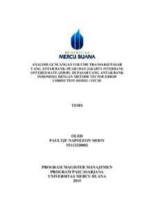 MOOY, PAULTJE NAPOLEON (2015) ANALISIS GUNCANGAN VOLUME TRANSAKSI PASAR UANG ANTAR BANK (PUAB) DAN JAKARTA INTERBANK OFFERED RATE (JIBOR) DI PASAR UANG ANTAR BANK INDONESIA DENGAN METODE VECTOR ERROR CORRECTION MODEL (VECM). S2 thesis, UNIVERISTAS MERCU BUANA - BUNCIT.