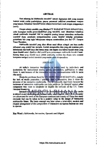 Saat sekarang ini Multimedia Interaktif banyak digunakan oleh orang maupun instansi untuk media pembelajaran, games, persentasi, publikasi perusahaaan maupun yang lainnya. Dikatakan interaktif karena adanya komunikasi 2 arah dengan penggunanya (user). Dengan adanya masalah yang dihadapi CV. HARAPAN TUNAS NUSANTARA, yaitu kurangnya media promosi/publikasi yang interaktif, maka dibutuhkan kehadiran sebuah multimedia interaktif. Hal ini sangatlah penting karena keberadaan multimedia interaktif dapat membantu mempublikasikan secara intraktif terhadap perusahaan-perusahaan lain yang ingin bekerjasama ataupun membutuhkan jasa dari CV. Harapan Tunas Nusantara. Multimedia interaktif yang akan dibuat nanti dibuat sebagai cara baru media informasi yang atraktif dan menarik. Setelah menganalisa data yang ada terutama pada kebudayaan dan hasil karya dari benua eropa dan negara cina bahwa banyak unsur yang dapat diambil untuk dijadikan nilai positif guna perancangan multimedia interaktif nanti. Konsep dasar yang diambil nanti adalah minimalis, modern dan elegan serta susunan komposisi navigasi tombol interaktif yang mudah untuk di operasikan. ABSTRACT At today's Interactive Multimedia is widely used by individuals and institutions for instructional media, games, presentation, publication or other firms. It said because of the interactive two-way communication with its users (the user). Given the problems faced by CV. HOPE TUNAS NUSANTARA, namely the lack of media promotion/publicity that is interactive, then it takes the presence of an interactive multimedia. This is especially significant because the existence of interactive multimedia can help publicize the intraktif against other companies who want to cooperate or require the services of the CV. Tunas Harapan Nusantara. Interactive multimedia that will be made later created as as a new way media is attractive and interesting information. After analyzing the data that exist mainly on culture and the work of the European continent and country of China that many elements that can be taken to be a positive value to the design of interactive multimedia future. The basic concept was later taken a minimalist, modern and elegant arrangement of the composition of interactive navigation buttons are easy to operate.