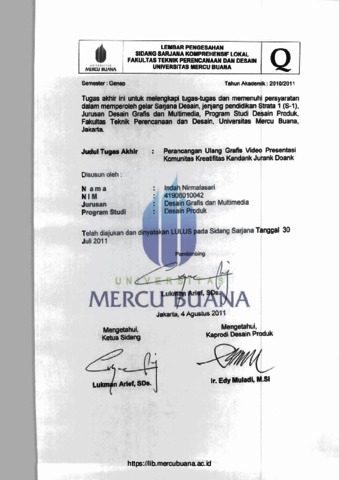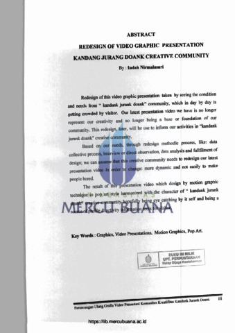 NIRMALASARI, INDAH (2011) PERANCANGAN ULANG GRAFIS VIDEO PRESENTASI KOMUNITAS KREATIVITAS KANDANK JURANK DOANK. S1 thesis, Universitas Mercu Buana Jakarta.