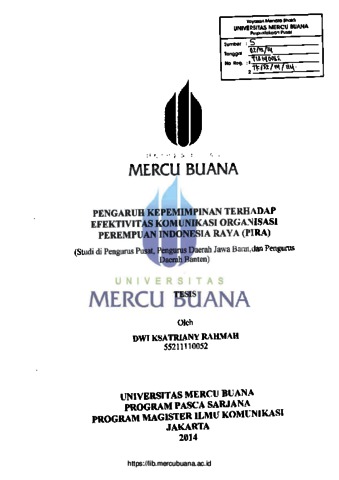 RAHMAH, DWI KSATRIANY (2014) PENGARUH KEPEMIMPINAN TERHADAP EFEKTIVITAS KOMUNIKASI ORGANISASI PEREMPUAN INDONESIA RAYA (PIRA) (Studi di Pengurus Pusat, Pengurus Daerah Jawa Barat, dan Pengurus Daerah Banten). S2 thesis, Universitas Mercu Buana Jakarta.