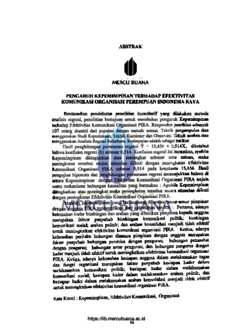PENGARUH KEPEMIMPINAN TERHADAP EFEKTIVITAS KOMUNIKASI ORGANISASI PEREMPUAN INDONESIA RAYA Berdasarkan pendekatan penelitian kuantitatif yang dilakukan metode analisis regresi, penelitian bertujuan untuk membahas pengaruh Kepemimpinan terhadap Efektivitas Komunikasi Organisasi PIRA. Responden penelitian sebanyak 107 orang diambil dari populasi dengan metode sensus. Teknik pengumpulan data menggunakan Studi Kepustakaan, Teknik Kuesioner dan Observasi. Teknik analisis data menggunakan Analisis Regresi Sederhana. Kesimpulan adalah sebagai berikut: Hasil penghitungan persamaan regresi tilde Y = 15 ,456+0,914X, diketahui bahwa koefisien regresi (b) sebesar 0,914. Koefisien regresi ini bermakna, apabila Kepemimpinan ditingkatkan atau meningkat sebesar satu satuan, maka peningkatan tersebut secara stimulan diikuti dengan peningkatan Efektivitas Komunikasi Organisasi PIRA sebesar 0,914 pada konstanta 15,456. Hasil pengujian hipotesis dan penghitungan persamaan regresi menunjukkan bahwa di antara Kepemimpinan dengan Efektivitas Komunikasi Organisasi PIRA terjain suatu mekanisme hubungan kausalitas yang bermakna Apabila Kepemimpinan ditingkatkan atau meningkat maka peningkatan tersebut secara stimulan diikuti dengan peningkatan Efektivitas Komunikasi Organisasi PIRA. Masalah kepemimpinan yang berlangsung di antara unsur-unsur pimpinan dengan anggota PIRA teridentifikasi dari kelemahan berikut: Pertama, adanya kelemahan kadar bimbingan dan arahan yang diberikan pimpinan kepada anggota merupakan faktor penyebab bimbingan komunikasi politik; bimbingan komunikasi sosial; arahan politik; dan arahan konsolidasi menjadi tidak efektif untuk meningkatkan efektivitas komunikasi organisasi PIRA. Kedua, adanya kelemahan perilaku hubungan diantara pimpinan dengan anggota merupakan faktor penyebab hubungan pembina dengan pengurus; hubungan penasehat dengan pengurus; hubungan antar pengurus; dan hubungan pengurus dengan kader menjadi tidak efektif untuk meningkatkan efektivitas komunikasi organisasi PIRA. Ketiga, adanya kelemahan kesiapan anggota dalam melaksanakan tugas dan fungsi organisasi merupakan faktor penyebab kesiapan kader dalam melaksanakan komunikasi politik; kesiapan kader dalam melaksanakan komunikasi sosial; kesiapan kader dalam melaksanakan arahan politik; dan kesiapan kader dalam melaksanakan arahan konsolidasi menjadi tidak efektif untuk meningkatkan efektivitas komunikasi organisasi PIRA. Kata Kunci: Kepemimpinan, Efektivitas Komunikasi, Organisasi