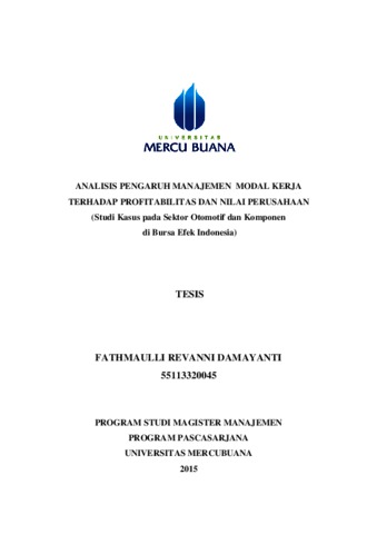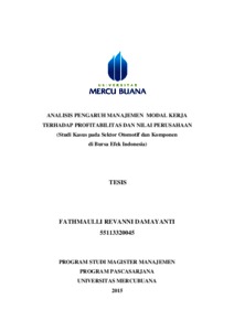 DAMAYANTI, FATHMAULLI REVANNI (2015) ANALISIS PENGARUH MANAJEMEN MODAL KERJA TERHADAP PROFITABILITAS DAN NILAI PERUSAHAAN (Studi Kasus pada Sektor Otomotif dan Komponen di Bursa Efek Indonesia). S2 thesis, UNIVERISTAS MERCU BUANA - BUNCIT.