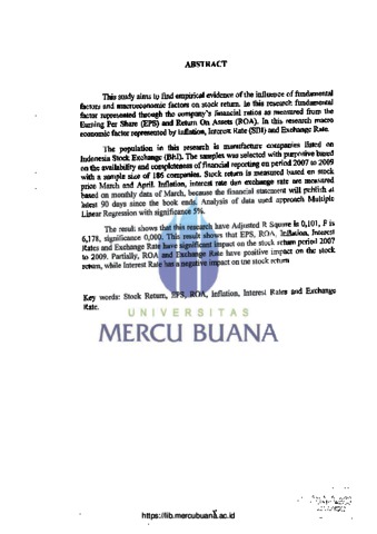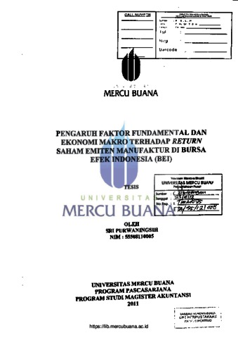 PURWANINGSIH, SRI (2011) PENGARUH FAKTOR FUNDAMENTAL DAN ΕΚΟΝΟΜΙ MAKRO TERHADAP RETURN SAHAM EMITEN MANUFAKTUR DI BURSA EFEK INDONESIA (BEI). S1 thesis, Universitas Mercu Buana Jakarta.
