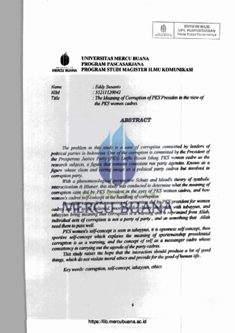 Masalah dalam penelitian ini adalah adanya kasus korupsi yang dilakukan oleh pimpinan partai politik di Indonesia. Yaitu kasus korupsi yang dilakukan oleh Presiden Partai Keadilan Sejahtera (PKS) bapak Lutfhi Hasan Ishaq. Kader PKS perempuan sebagai subyek penelitian, sosok yang tetap konsisten menjalankan agenda-agenda partai. Dikenal sebagai sosok yang bersih dan peduli namun dalam citra sebagai kader partai politik yang terlibat korupsi. Dengan perspektif fenomenologi Schutz dan teori interaksionisme simbolik Mead & Blumer, penelitian ini dilakukan untuk mengetahui apa makna kasus korupsi Presiden PKS bagi kader PKS perempuan, dan bagaimana konsep diri kader PKS perempuan dalam menghadapi kasus korupsi tersebut. Dari penelitian ini makna korupsi presiden PKS bagi kader PKS perempuan adalah sebagai hal yang tidak bisa dipercaya, harus dicari kejelasan dan kebenarannya dengan tabayyun, dengan ber-tabayyun memunculkan pemaknaan bahwa kasus korupsi adalah sebuah peringatan dan teguran dari Alloh, kasus korupsi adalah perbuatan perorangan bukan jamaah partai, dan sebagai sebuah garis dari Alloh untuk dilalui dengan baik. Konsep diri kader PKS perempuan adalah konsep diri keterbukaan yang terlihat dalam tabayyun, konsep diri sportif yang tergambar dari makna korupsi presiden adalah sebuah peringatan, dan konsep diri sebagai kader dakwah yang terlihat dari konsistensi kader dalam menjalankan agenda partai. Penelitian ini memunculkan harapan bahwa dalam interaksi hendaknya menghasilkan banyak hal-hal yang baik, yang tidak melanggar etika moral dan memberikan kebaikan bagi kehidupan manusia. Kata Kunci: korupsi, konsep diri, tabayyun, etika moral