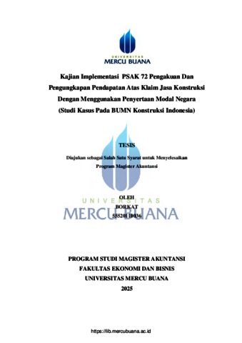 BORKAT, BORKAT (2025) KAJIAN IMPLEMENTASI PSAK 72 PENGAKUAN DAN PENGUNGKAPAN PENDAPATAN ATAS KLAIM JASA KONSTRUKSI DENGAN MENGGUNAKAN PENYERTAAN MODAL NEGARA (Studi Kasus Pada BUMN Konstruksi Indonesia). S2 thesis, Universitas Mercu Buana Jakarta.