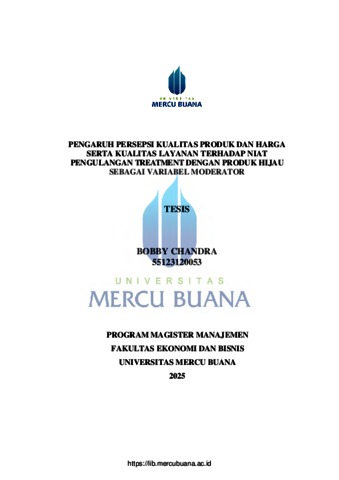 CHANDRA, BOBBY (2025) PENGARUH PERSEPSI KUALITAS PRODUK DAN HARGA SERTA KUALITAS LAYANAN TERHADAP NIAT PENGULANGAN TREATMENT DENGAN PRODUK HIJAU SEBAGAI VARIABEL MODERATOR. S2 thesis, Universitas Mercu Buana Jakarta.