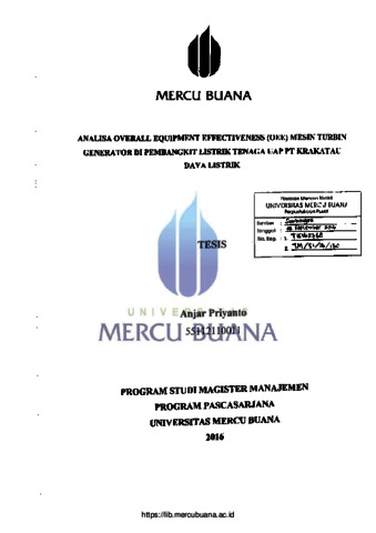 ANJAR PRIYANTO, ANJAR PRIYANTO (2016) ANALISA OVERALL EQUIPMENT EFFECTIVENESS (OEE) MESIN TURBIN GENERATOR DI PEMBANGKIT LISTRIK TENAGA UAP PT KRAKATAU DAYA LISTRIK. S2 thesis, Universitas Mercu Buana Jakarta.