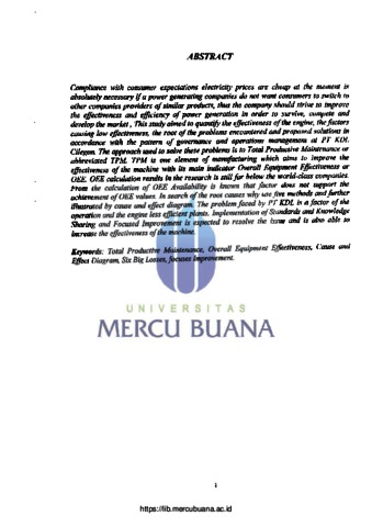 Pemenuhan terhadap harapan konsumen akan harga listrik yang murah saat ini sangatlah mutlak dilakukan apabila suatu perusahaan pembangkit listrik tidak ingin konsumennya beralih ke perusahaan lain penyedia produk sejenis, dengan demikian perusahaan harus berusaha keras meningkatkan efektifitas dan efisiensi mesin pembangkit untuk dapat bertahan, bersaing dan mengembangkan pasar. Penelitian ini bertujuan untuk menghitung tingkat efektifitas mesin, faktor-faktor penyebab rendahnya efektifitas, akar masalah yang dihadapi dan usulan solusinya yang sesuai dengan tata kelola dan pola manajemen operasi di PT KDL Cilegon. Pendekatan yang digunakan untuk menyelesaikan permasalahan tersebut adalah dengan Total Productive Maintenance atau disingkat TPM. TPM merupakan salah satu unsur manufaktur yang bertujuan untuk meningkatkan efektifitas mesin dengan indikator utamanya yaitu Overall Equipment Effectiveness atau OEE. Hasil perhitungan OEE dalam penelitian masih jauh dibawah standar perusahaan berkelas dunia. Dari hasil perhitungan OEE diketahui bahwa faktor Availability sangatlah tidak mendukung pencapaian nilai OEE. Dalam mencari akar permasalahan digunakan metode five why dan selanjutnya digambarkan dengan cause and effect diagram. Permasalahan yang dihadapi oleh PT KDL adalah faktor pengoperasian dan mesin pembangkit yang kurang efisien. Pelaksanaan Standarisasi dan Knowledge Sharing serta Focused Improvement diharapkan dapat menyelesaikan permasalah tersebut dan juga mampu meningkatkan efektifitas mesin. Kata Kunci: Total Productive Maintenance, Overall Equipment Effectiveness, Cause and Effect Diagram, Six Big Losses, Focuses Improvement.